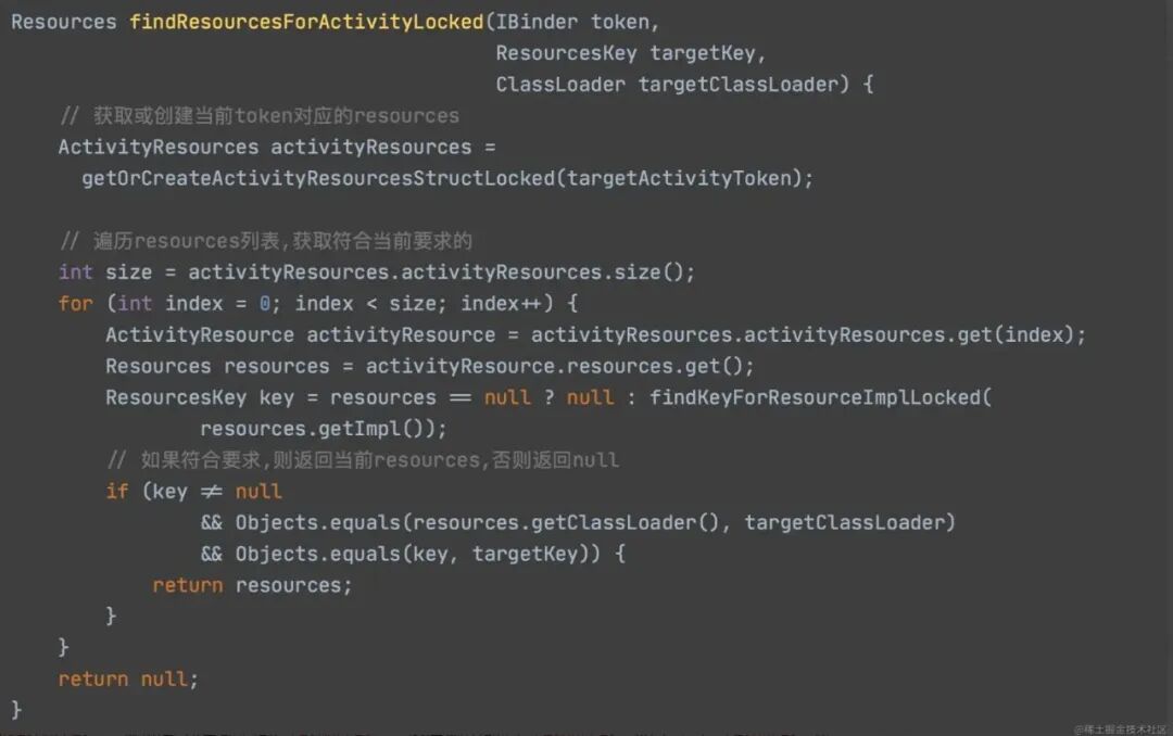 当通过 findResourcesForActivityLocked() 获取指定的 resources 时,内部会先获取当前 token 对应的 activityResources ,从而拿到其所有的 resources。然后遍历所有 resources,如果某个 resouces 对应的 key(ResourcesKey)与当前查找的一致并且符合其他规则,则直接返回,否则无符合条件时返回null。