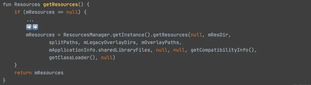 当我们获取 resources 时,内部会先判断是否存在,如果不存在,则调用 ResourcesManager.getResources() 去获取新的 resources 并返回,否则直接返回现有的。相应的,我们再去看看 ResourcesManager.getResources() 。