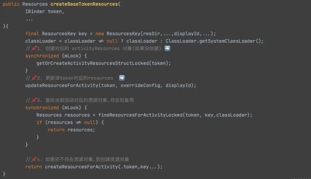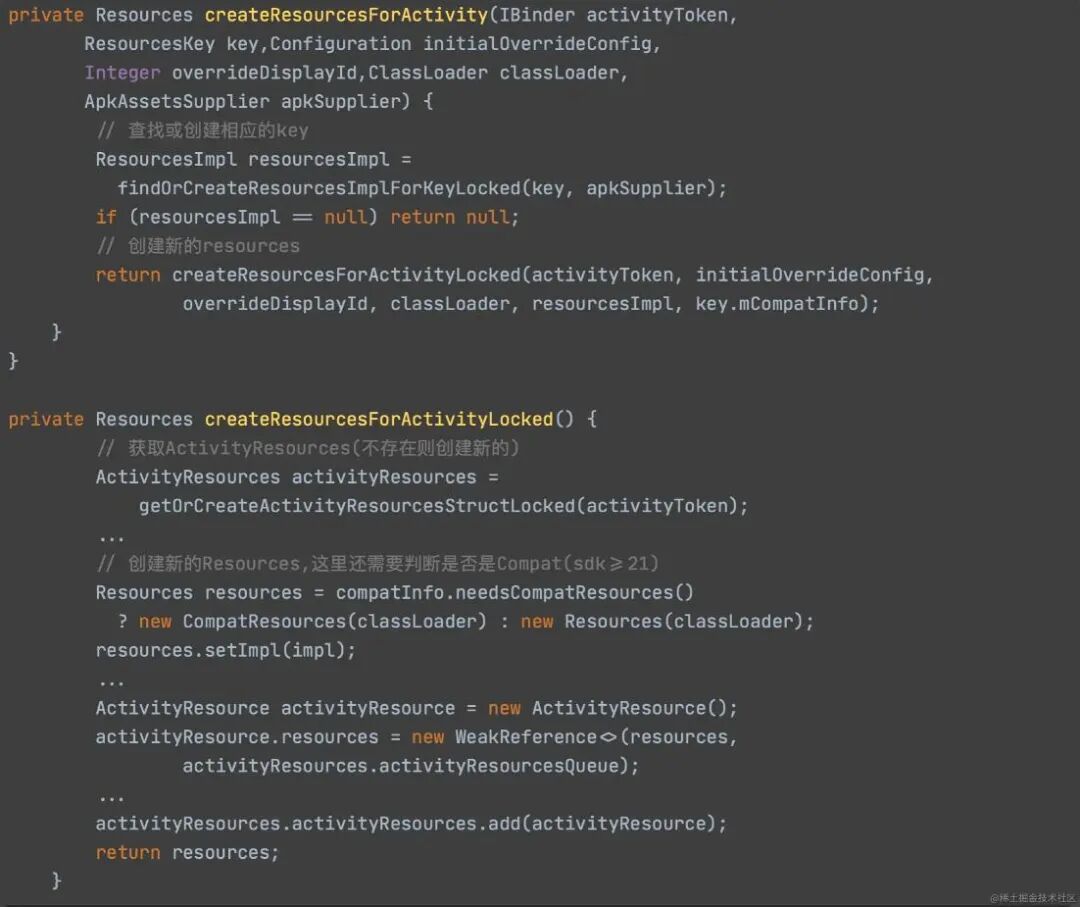 在创建 Resources 时,内部会先使用 key 查找相应的 ResourcesImpl,如果没找到,则直接返回null,否则调用 createResourcesForActivityLocked() 创建新的 Resources。