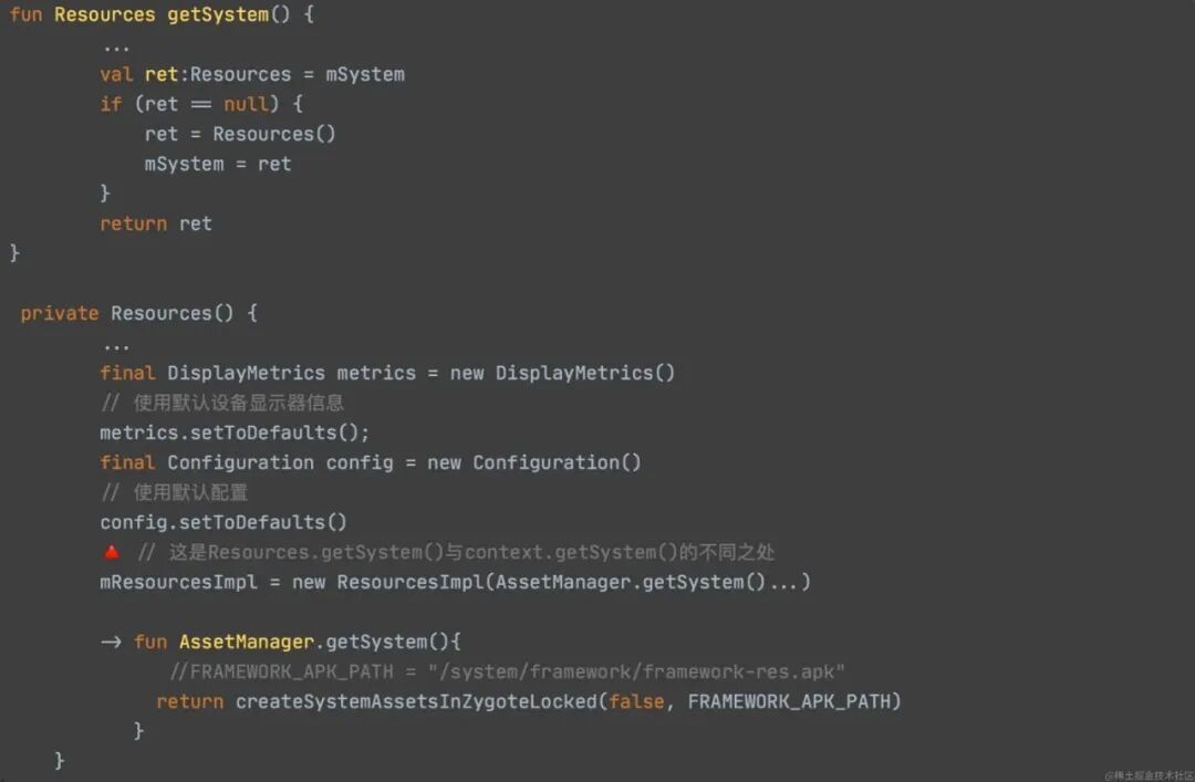 当我们使用 Resources.getSystem() 时,其实也就是在调用当前 framework 层的资源对象,内部会先判断是否为 null,然后进行初始化,初始化的过程中,因为系统框架层的资源,所以实际的资源管理器直接调用了 AssetManager.getSystem(),这个方法内部会使用当前系统框架层的apk作为资源路径。所以我们自然也无法用它去加载我们 Apk 内部的资源文件。