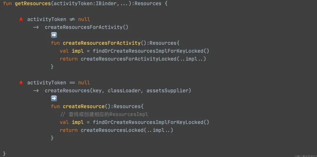 如上所示,内部会对传入的 activityToken 进行判断,如果为不为 null,则调用 createResourceForActivity() 去创建;否则调用 createResources() 去创建,具体内部的逻辑和最开始相似,内部会先使用 key 查找相应的 ResourcesImpl,如果没找到,则分别调用相关方法再去创建 Resources 。