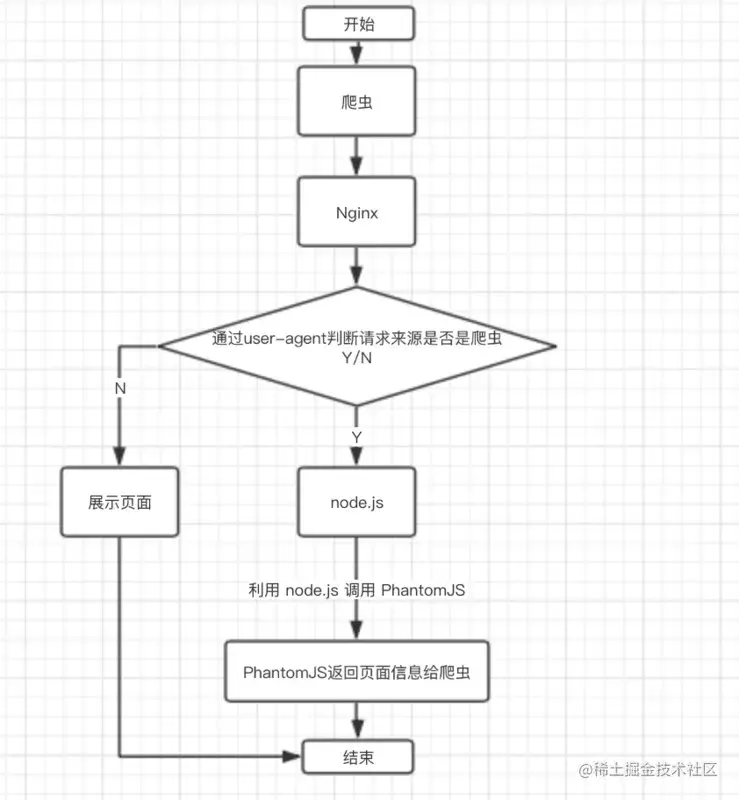 原理是通过Nginx配置,判断访问来源是否为爬虫,如果是则搜索引擎的爬虫请求会转发到一个node server,再通过PhantomJS来解析完整的HTML,返回给爬虫。下面是大致流程图