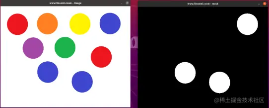 首先我们需要加载图像,然后我们将图像转换为HSV颜色。img = cv2.imread('www.linuxmi.com.png')hsv = cv2.cvtColor(img, cv2.COLOR_BGR2HSV)之后,您需要确定颜色的上限和下限,可以为此建议使用imutils。在上图中,我们将检测三种蓝色。lower_range = np.array([110,50,50])upper_range = np.array([255,255,0])之后,我们需要创建图像的蒙版。mask = cv2.inRange(hsv, lower_range, upper_range)最后我们需要展示图像和蒙版。cv2.imshow('www.linuxmi.ccom - image', img)cv2.imshow('www.linuxmi.ccom - mask', mask)