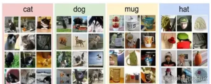 那么,如何编写一个图像分类的算法呢?又怎么从众多图像中识别出猫呢?这里所采取的方法和教育小孩看图识物类似,给出很多图像数据,让模型不断去学习每个类的特征。在训练之前,首先需要对训练集的图像进行分类标注,如图所示,包括cat、dog、mug和hat四类。在实际工程中,可能有成千上万类别的物体,每个类别都会有上百万张图像。