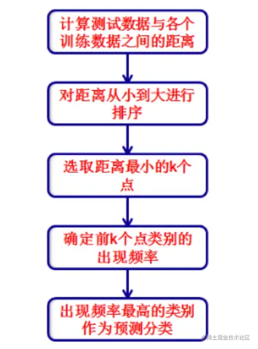 该算法在建立训练集时,就要确定训练数据及其对应的类别标签;然后把待分类的测试数据与训练集数据依次进行特征比较,从训练集中挑选出最相近的k个数据,这k个数据中投票最多的分类,即为新样本的类别。KNN分类算法的流程描述为如下图所示。