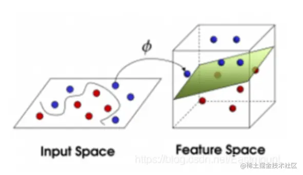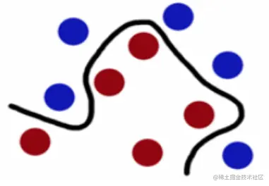 - 在下图中,想象红球和蓝球为球台上的桌球,首先需要找到一条曲线将蓝球和红球分开,于是得到一条黑色的曲线。