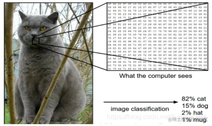 在下图中,图像分类模型将获取单个图像,并将为4个标签{cat,dog,hat,mug},分别对应概率{0.6, 0.3, 0.05, 0.05},其中0.6表示图像标签为猫的概率,其余类比。该图像被表示为一个三维数组。在这个例子中,猫的图像宽度为248像素,高度为400像素,并具有红绿蓝三个颜色通道(通常称为RGB)。因此,图像由248×400×3个数字组成或总共297600个数字,每个数字是一个从0(黑色)到255(白色)的整数。图像分类的任务是将这接近30万个数字变成一个单一的标签,如“猫(cat)”。
