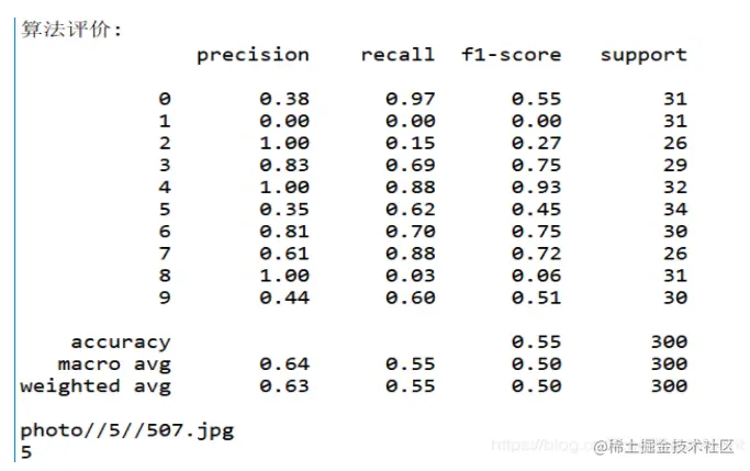 使用朴素贝叶斯算法进行图像分类实验,最后预测的结果及算法评价准确率(Precision)、召回率(Recall)和F值(F1-score)如图所示。
