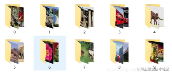 接着将所有各类图像按照对应的类标划分至“0”至“9”命名的文件夹中,如图所示,每个文件夹中均包含了100张图像,对应同一类别。