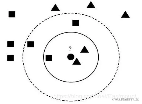 假设现在需要判断下图中的圆形图案属于三角形还是正方形类别,采用KNN算法分析如下: