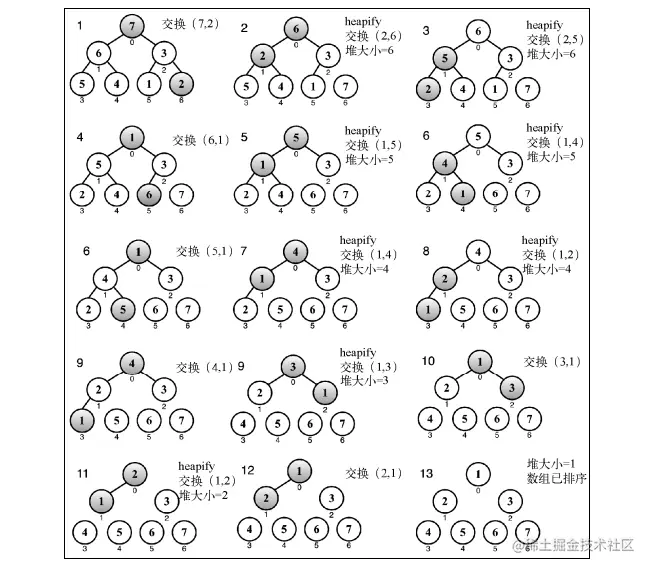 - 最后将堆的根节点下移并重复 2 直到堆的大小为 1