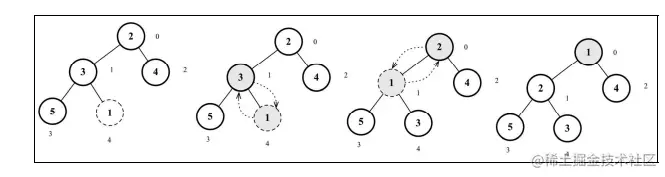 移除最小值(最小堆)或最大值(最大堆)表示移除数组中的第一个元素(堆的根节点)。移除后将堆的最后一个元素移动至根部并执行 siftDown 函数,表示将交换元素直到堆的结构正常。