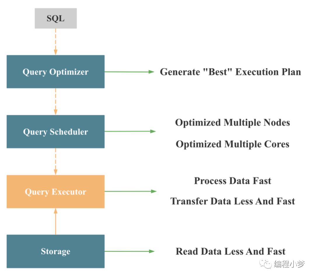 如图,大家都知道,传统数据库的用户接口一般是 SQL, 而 SQL 是声明式语言, 只描述了 What,没有描述 How, 所以数据库接收到 SQL,需要先通过查询优化器将 SQL 转为可执行的物理执行计划 (也就是 How),再将物理执行计划交给查询执行器执行。