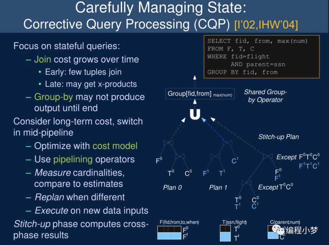 类似于前面的全局在运行时重新 Plan,我们也可以在局部动态切换 Plan,如图是一个 3 表 Join 后再 group by 的例子,我们在运行时变换 3 表 Join 的顺序,但是这里需要注意的点,为了保证结果的正确性,我们需要再额外加入一个缝补或者纠正的 Plan:让分别在 Plan 0 和 plan 1 执行的两部分数据 (T0,T1, C0,C1)再 Join 一次,然后把 3 部分数据再 Union 一下。