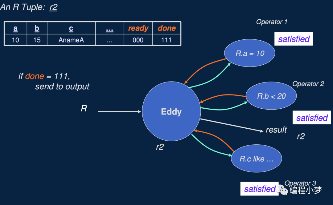 如上面两个图所示,是 Eddy 自适应处理多个谓词顺序的示例,假如表 R 的查询有 R.a = 10, R.b < 20, R.c like 'xxx', Eddy 就会动态的自适应调整每行数据被每个谓词处理的顺序,自适应调整的时候注意会考虑 每个谓词的选择度 和 每个谓词本身计算的代价。而要实现这一点, Eddy 算子就必须记录每行数据需要被哪些谓词处理,以及是否处理完成。eddy 算子是通过给每行数据新增两个 ready 和 done 字段来完成的,ready 表示是否需要每个谓词处理,done 表示每个谓词是否处理完成。