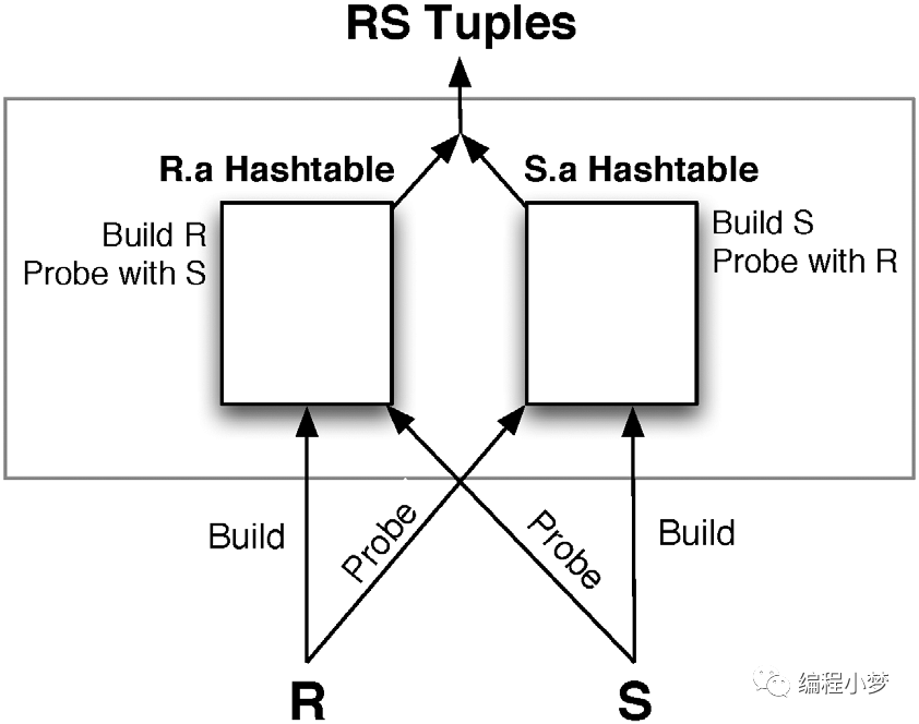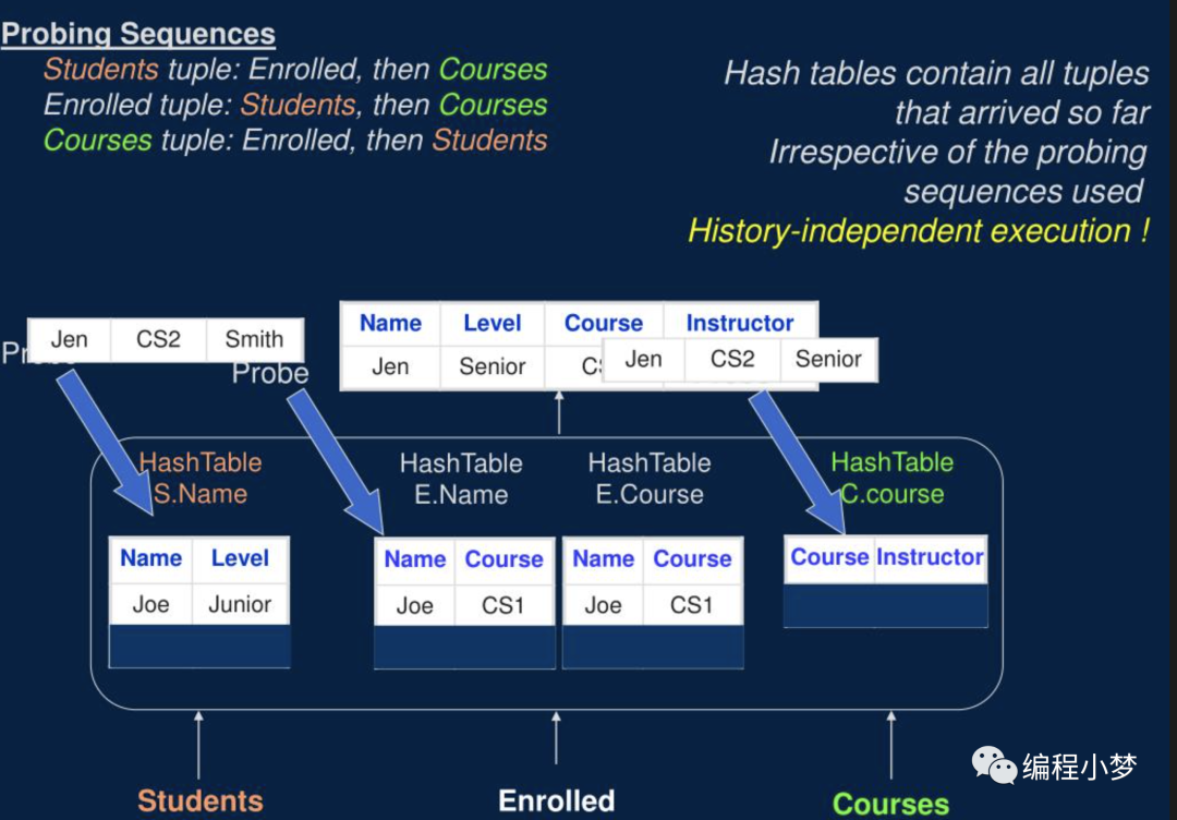 传统的 Hash Join 一般是用右表去构建 Hash 表,然后左表去 Probe,这样就没有自适应的空间。如上图所示,Symmetric Hash Joins 是左右表数据都会构建 Hash 表,当然大家会发现,这样相比传统的 Hash join 肯定会使用更多的内存,所以 Symmetric Hash Joins 主要是用在 streaming 处理场景。和 Eddy 算子搭配之后,Symmetric Hash Joins 就可以比较好的进行多表Join Reorder 的自适应。