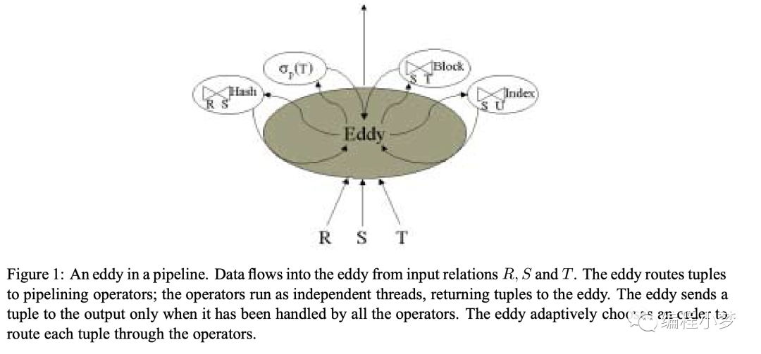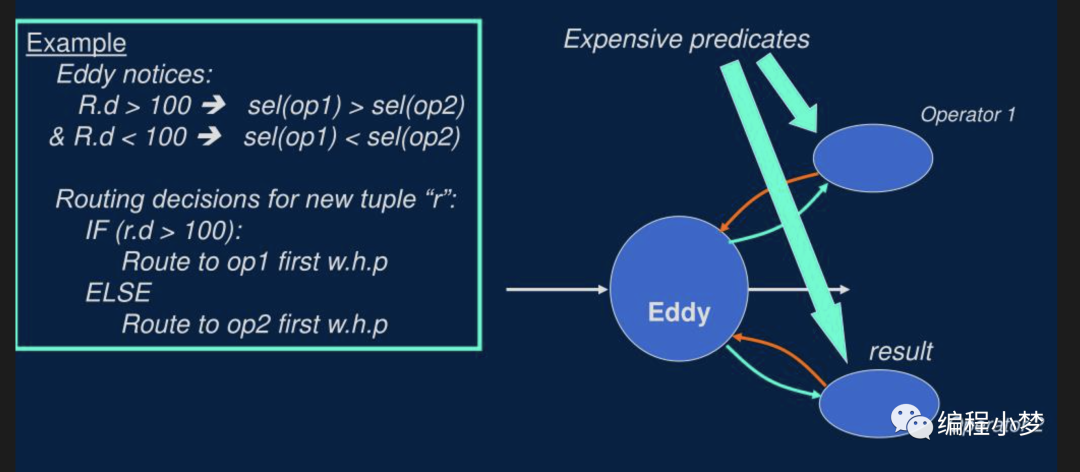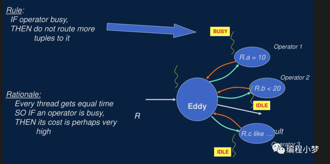 如上图所示,Eddy 在 Pipeline 中是一个决策控制算子,会控制连接多个实际执行的算子,假如要完成 3 表 Join, Eddy 在 tuple 粒度控制每行数据进入每个 join 算子的顺序,并动态调整整个顺序,让每个 join 算子处理的数据量尽可能均衡,让整体系统资源尽可能利用的更充分。