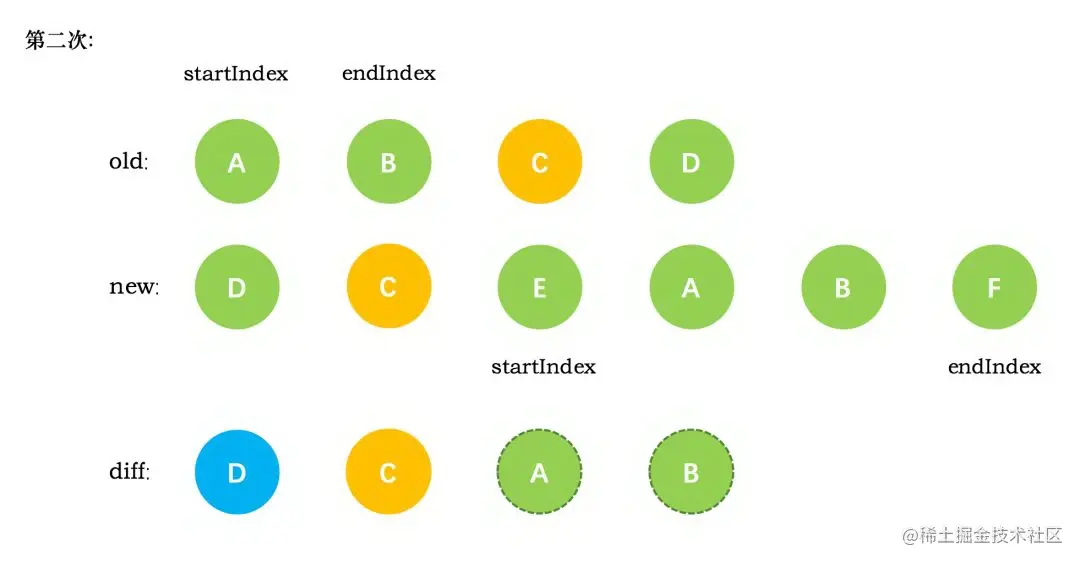 第一次循环后,发现旧节点D与新节点D相同,直接复用旧节点D作为diff后的第一个真实节点,同时旧节点endIndex移动到C,新节点的 startIndex 移动到了 C
