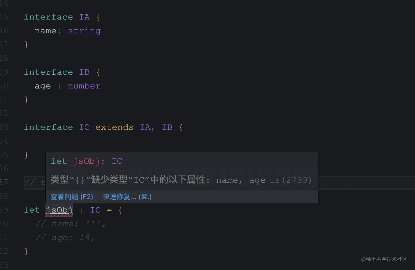 TypeScript关键字之extends laughing66 2022-12-07 130 阅读1分钟 场景 类型继承(interface 可用 extends 继承,type 不可以) 定义范型,约束范型必须是与目标类型匹配的(继承的) // T 被称为泛型变量,它是我们希望传递给 identity 函数的类型占位符 function getSome<T extends P, P> (p1: T, p2: P): number { return 1 } getSome({a: 1}, {a: 1, b: 3}) 条件匹配,判断类型 A 是否匹配(继承)类型 B