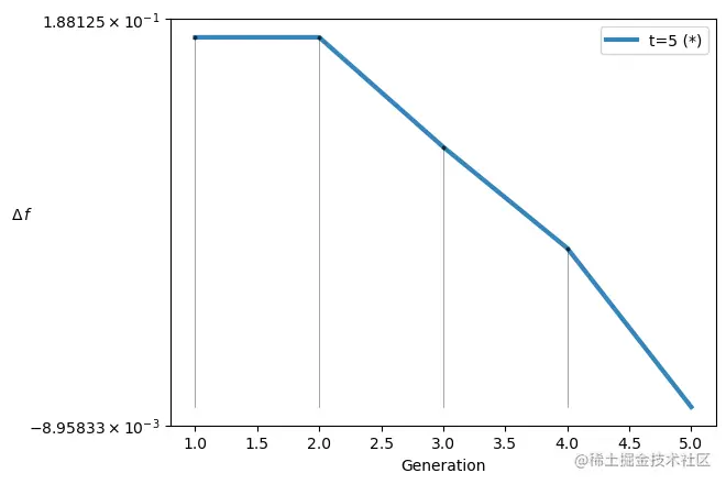当真实的Pareto前沿未知时,还可以使用近几年提出的性能评价指标Running Metric。Running Metric指标度量显示了不同代之间目标空间的差异,并使用算法的存活率来可视化改进。在Pymoo中,如果没有定义终止标准,也可以使用Running Metric作为多目标优化算法的终止条件。