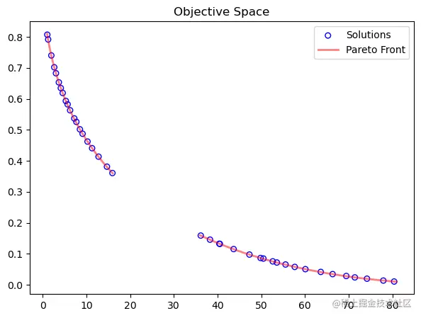 另外,根据文献2这一篇文章,我们得知由于MyProblem问题相对来说比较简单,我们可以得到其Pareto前沿。