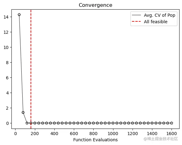 为了使用Pymoo进行算法收敛性分析之前,我们首先应该得到一个优化问题及其分析结果。这里以文献1中Pymoo定义的具有两个约束及双目标优化问题MyProblem及其分析结果为例,进行本文的优化算法收敛性分析过程。