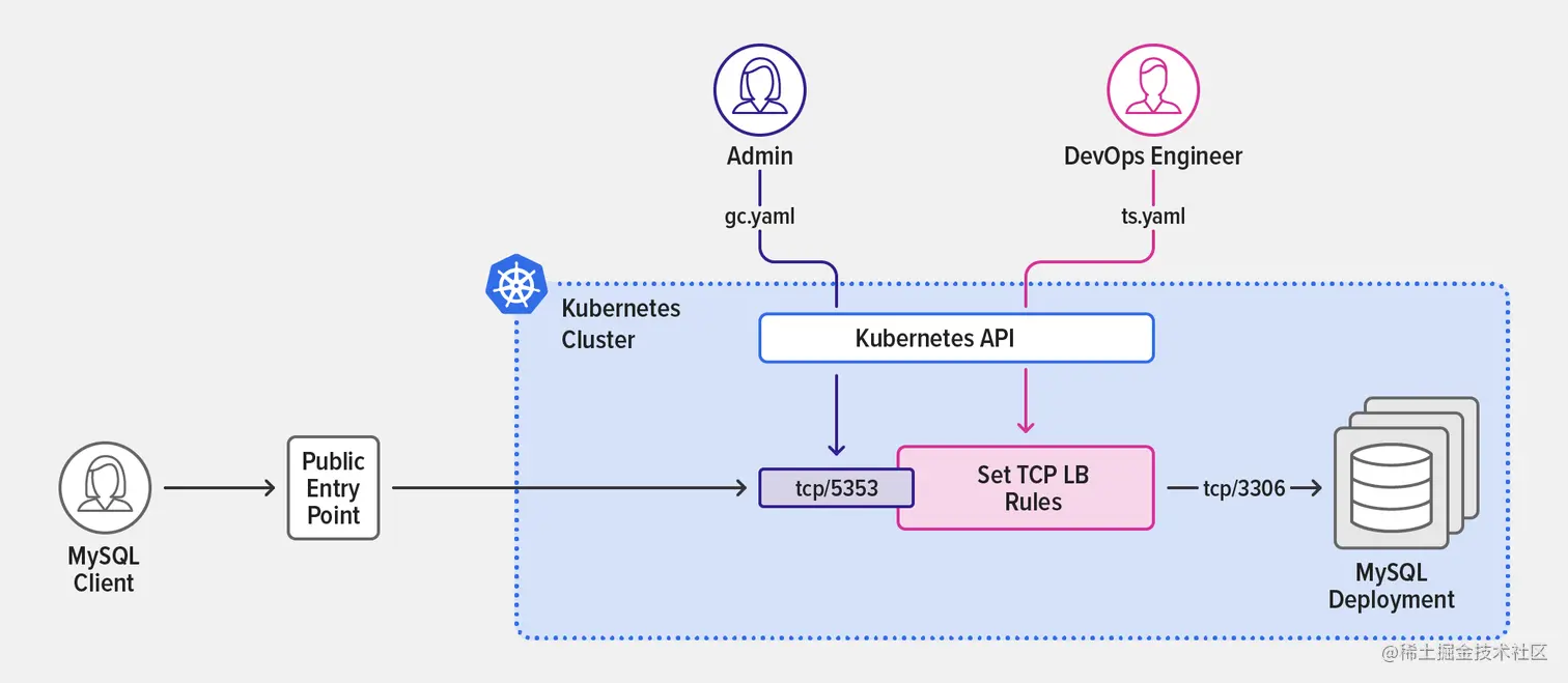 下图描述了 GlobalConfiguration 和 TransportServer 资源的用例示例。在 gc.yaml 中,集群管理员在 GlobalConfiguration 资源中定义了 TCP 和 UDP 监听器。在 ts.yaml 中,DevOps 工程师在 TransportServer 资源中引用了 TCP 监听器,以便将流量路由到 MySQL Deployment。
