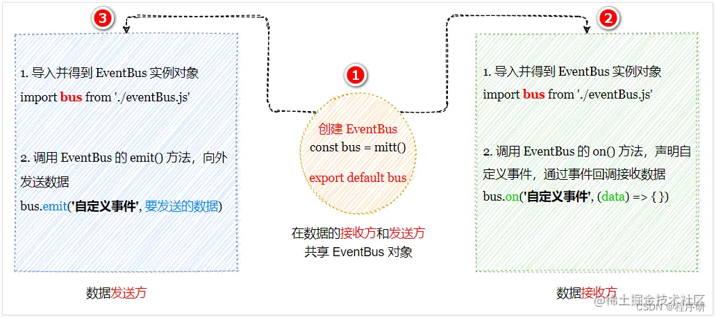 兄弟组件之间实现数据共享的方案是EventBus。可以借助于第三方的包mitt 来创建eventBus 对象,从而实现兄弟组件之间的数据共享。示意图如下: