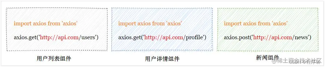 在实际项目开发中,几乎每个组件中都会用到 axios 发起数据请求。此时会遇到如下两个问题: