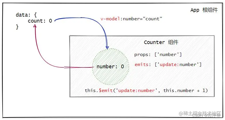 父组件在使用子组件期间,可以使用v-model 指令维护组件内外数据的双向同步: