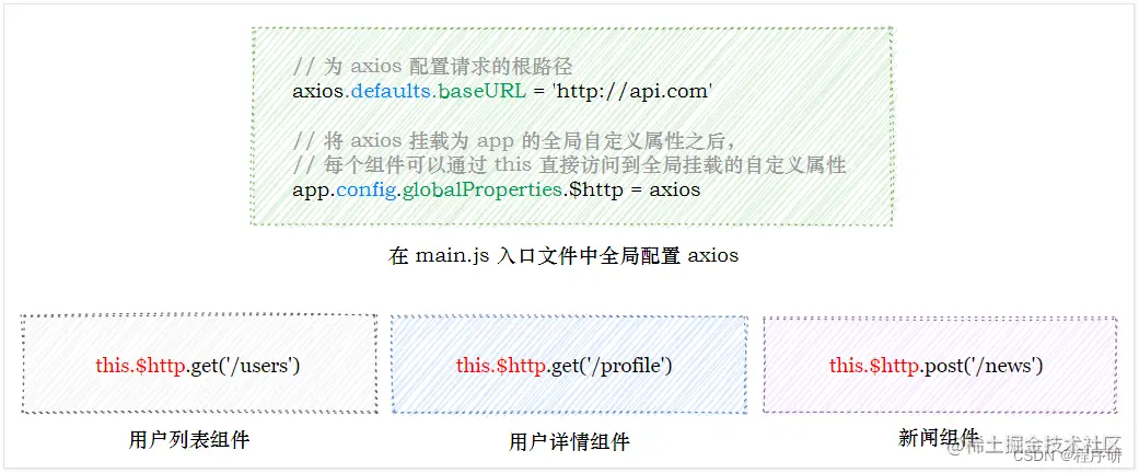 在main.js 入口文件中,通过app.config.globalProperties 全局挂载 axios,示例代码如下:
