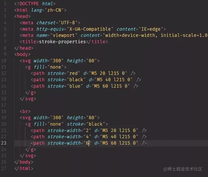 打开编辑器,新建一个 stroke-properties.html 文件,补全基础代码,在 body 里添加一个 svg 标签,定义属性 width 等于 300,height 等于 80。