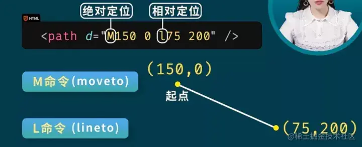 L 命令,是 lineto 的缩写,用来绘制一条直线。例如 l 75 200 (读小l,空格,75,空格,200) ,也可以写成 l75 200 (读作小l,75,空格,200),表示从上一个结束点到 x 75,y 200 (直接读) 这个点绘制一条直线。