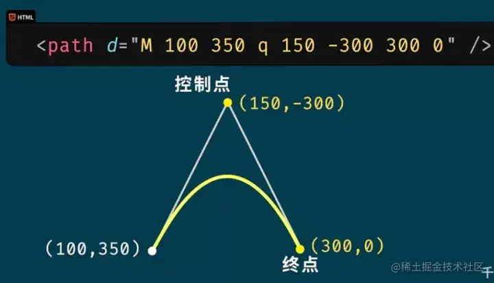 Q 是 quadratic Bézier curve ([kɜːrv]) 的缩写,用来绘制二次贝塞尔曲线,需要定义控制点和终点的坐标。例如 q 150 -300 300 0,表示控制点坐标是 x 150,y -300,终点坐标是 x 300,y 0。这个比较难理解,大家来看一下二次贝塞尔曲线绘制示意图。