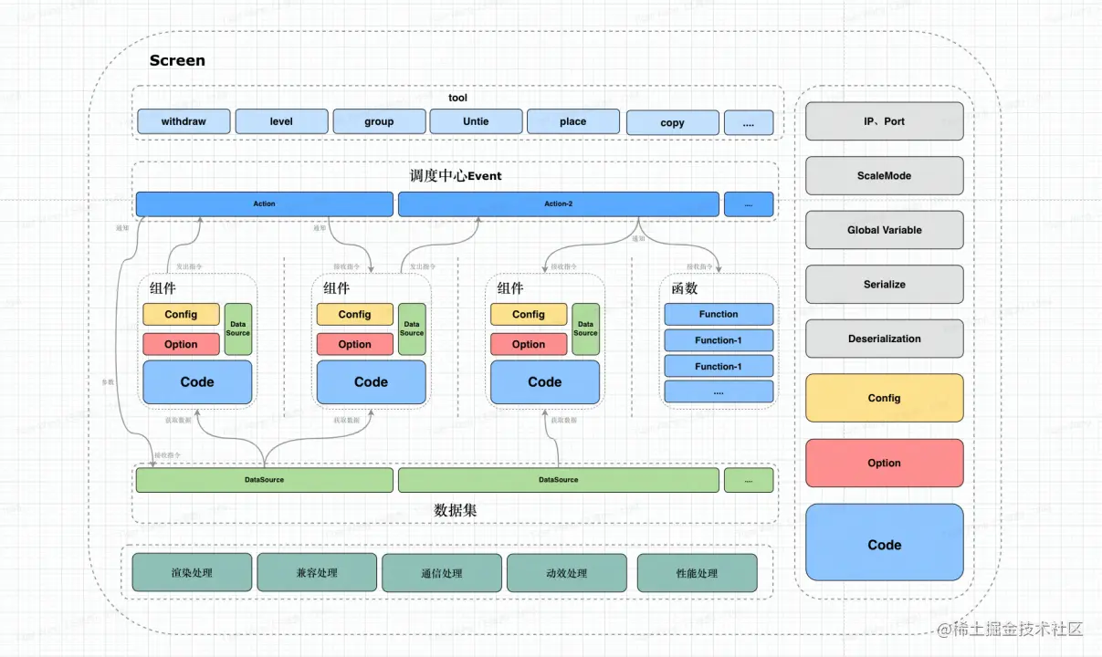 FlyFish 整体架构如下图所示。组件与组件之间相互隔离,且通过Event调度中心与函数进行交互。数据源接入系统后,可以被封装成数据集合被大屏调用。此外,FlyFish 在渲染处理、兼容处理、通信处理、动效处理以及性能处理方面均做了优化。