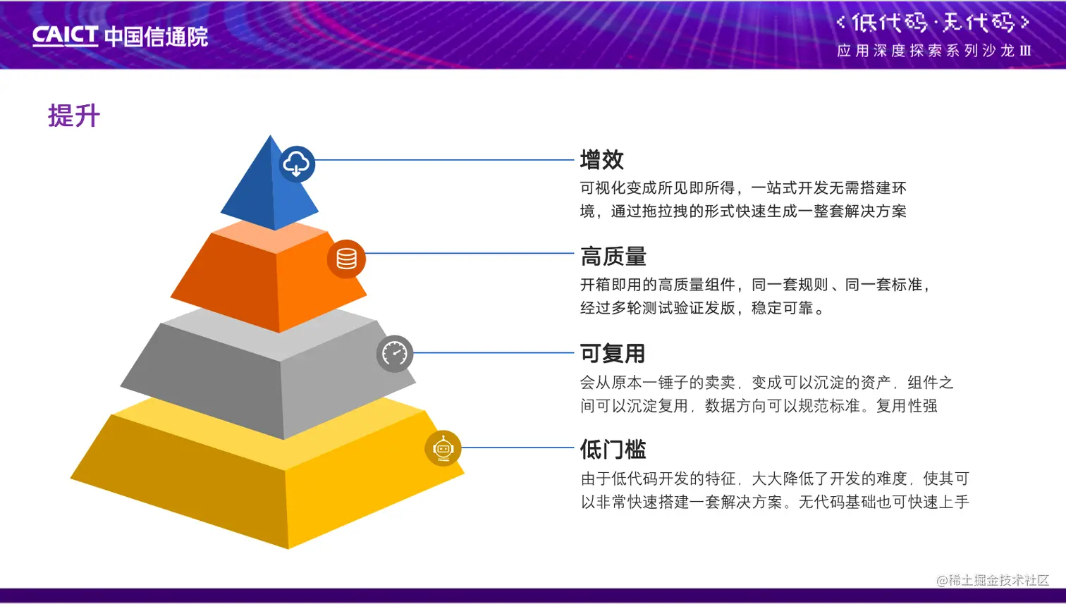 低代码作为一种全新的开发模式,相比于传统开发模式,低代码很大程度地减少了开发者代码量,使开发者通过简单地复刻及拖拉拽即可完成应用开发。另一方面,由于低代码的简单直观性,开发者也更容易发现技术应用业务过程中的问题。因此低代码更能加快开发者在技术领域的成长速度,具体表现为以下几方面: