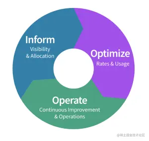 FinOps 基金会建议采用迭代方法来管理云服务的可变成本。最佳实践包括应持续管理的三个环节:通知、优化和运营。