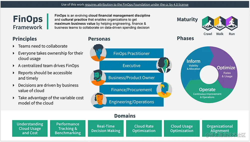 此外,FinOps还有几个非常重要的维度,包括六大原则、角色、循环方法论、成熟度模型。