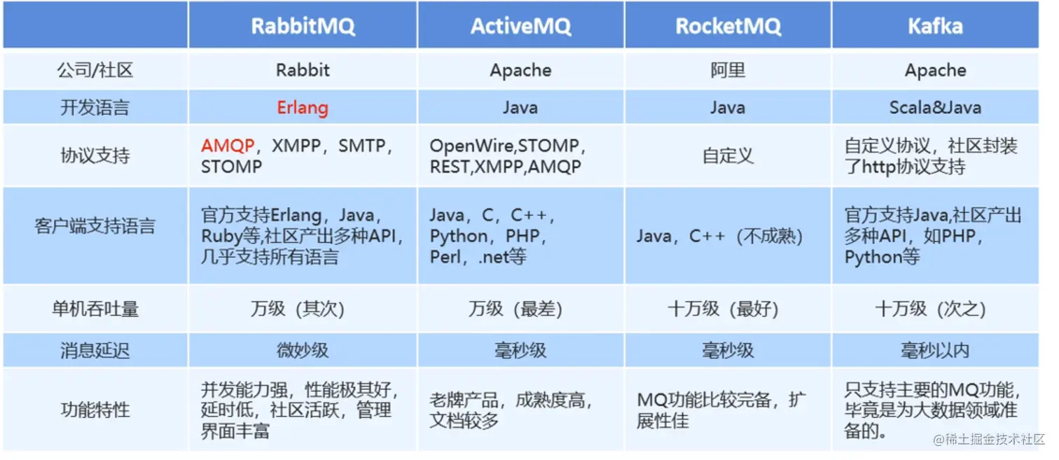 目前业界有很多的MQ产品,例如RabbitMQ,RocketMQ,ActiveMQ,Kafka,ZeroMQ,MetaMQ等,也有直接使用Redis充当消息队列的案例,而这些消息队列产品,各有侧重,在实际选型时,需要结合自身需求以及MQ产品特征,综合考虑