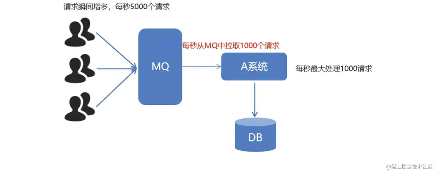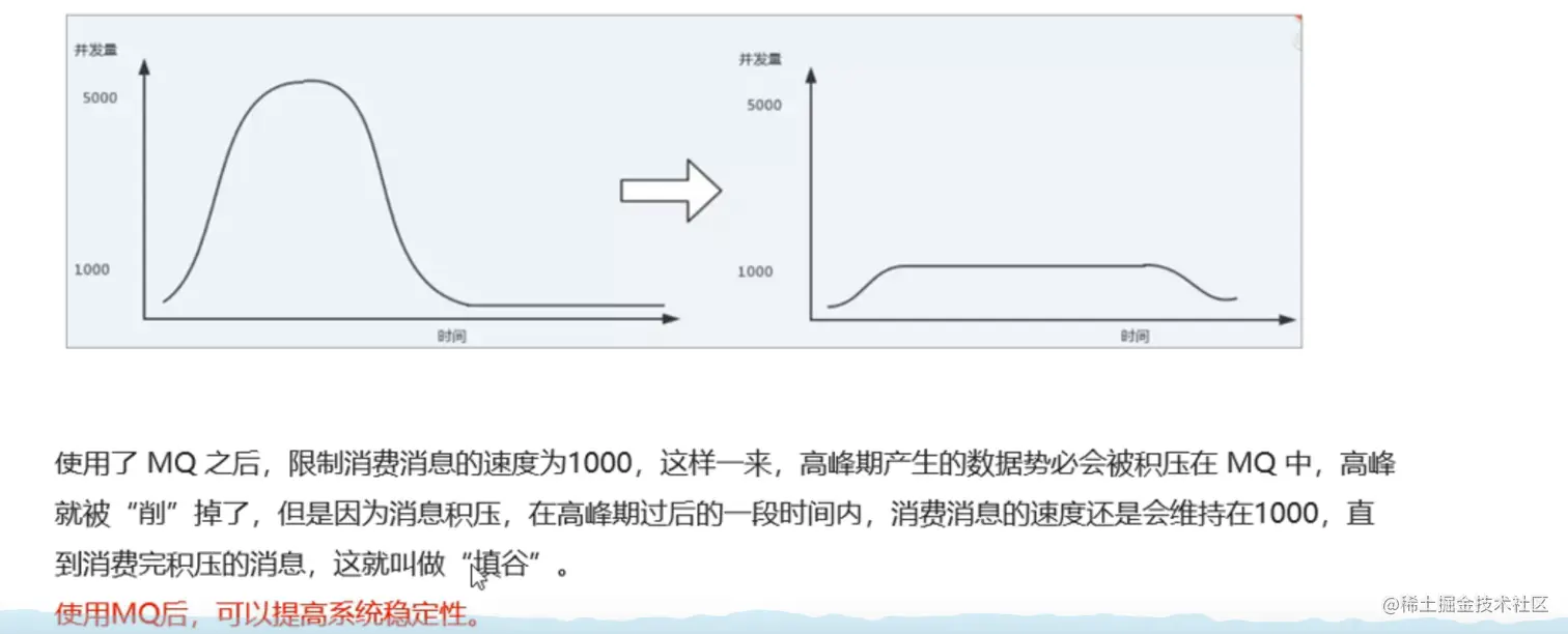 使用MQ的分布式系统,全部的并发量不会直接访问系统,而是直接由MQ接收,然后再由系统慢慢从MQ拉取请求进行处理,保证了系统的稳定性