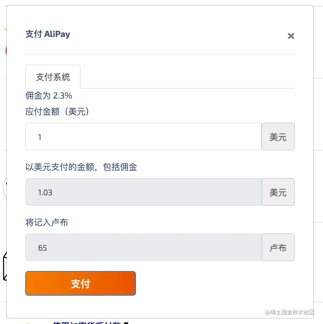 选择充值1美金,加上手续费大概花费7块多人民币,选择使用支付宝扫码支付。就能获得大概65卢布,用于后续步骤中购买一个虚拟手机号。实际只需要10卢布左右可以完成购买。
