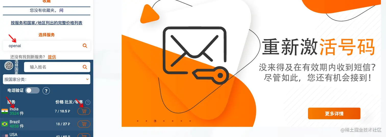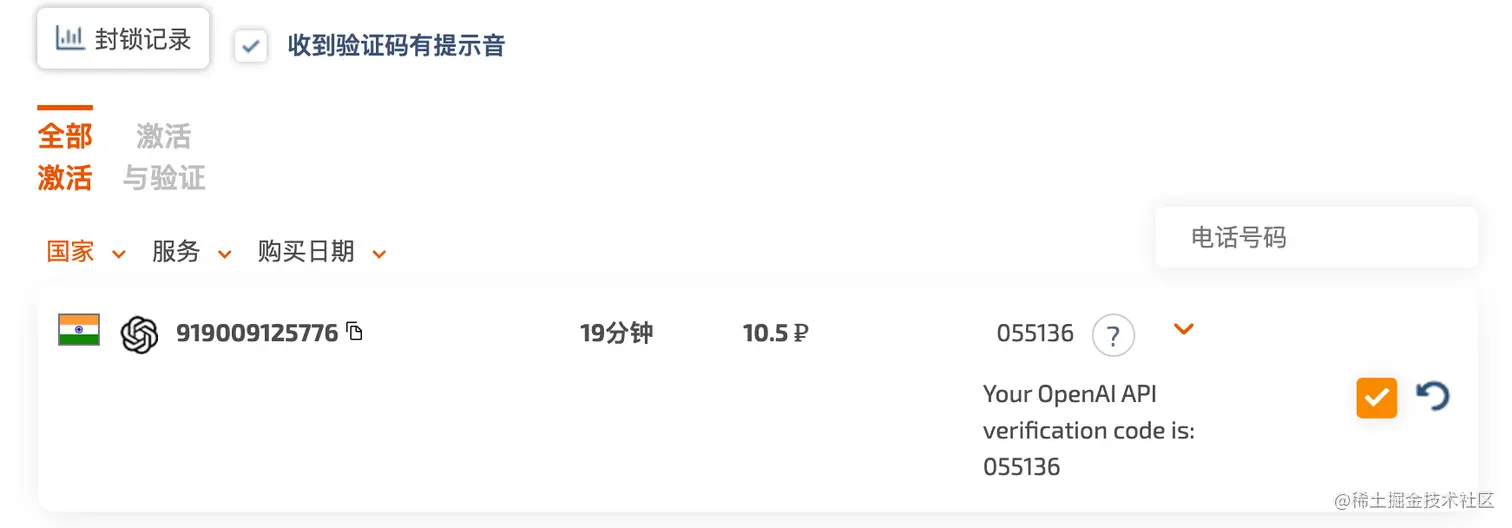 在左侧输入openai进行服务搜索,选择第一个印度,最便宜只要10.5卢布。这样在自己的用户中心就能看到已经购买好的手机号码。