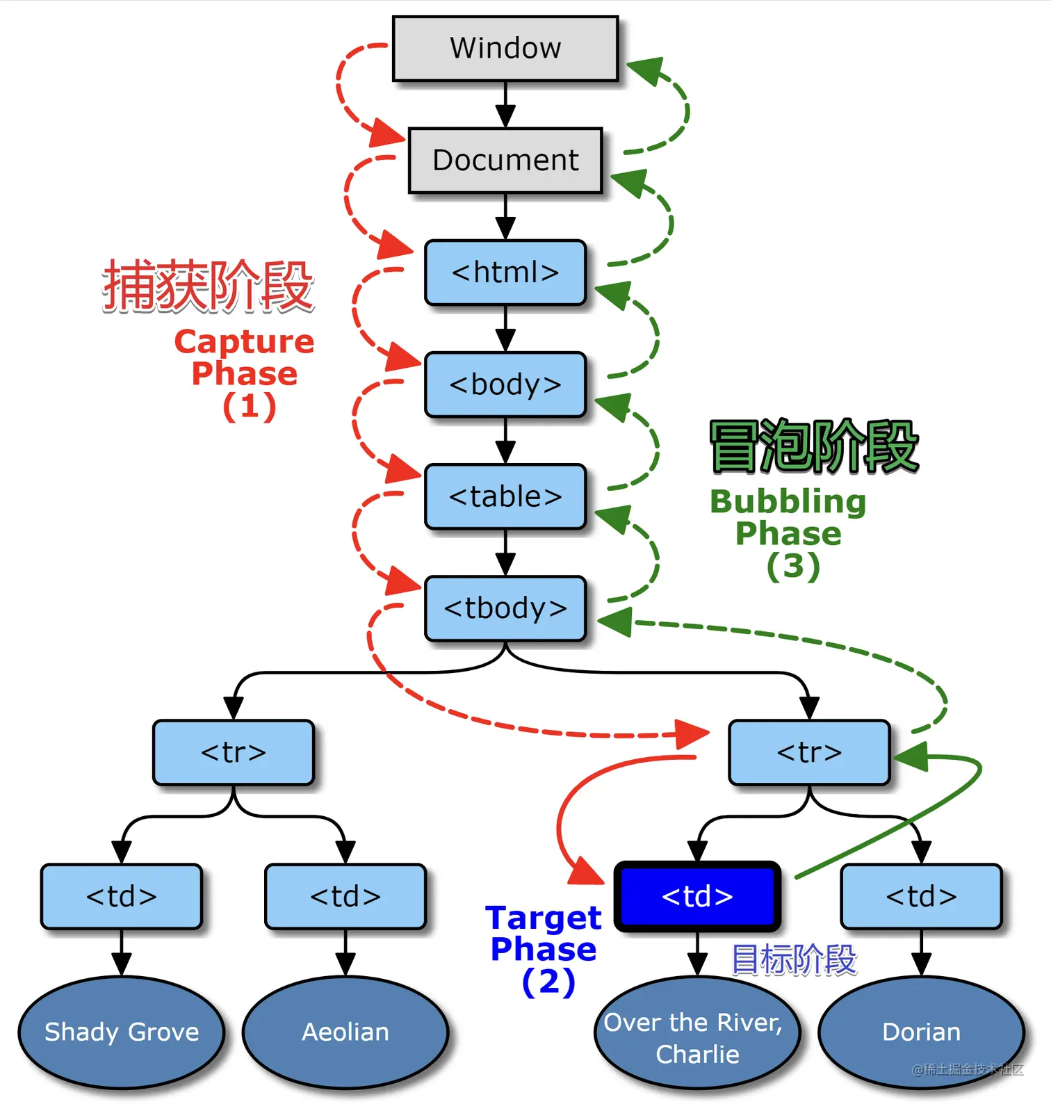 下图表示了在表格中点击<td>事件的流动,途中调用处理程序
