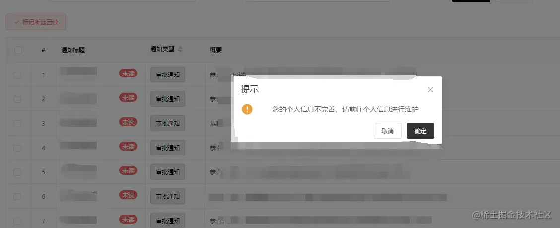 登录系统之后需要先拿到当前用户的信息,如果检测到手机号等信息都是完整的,就不需要操作,否则弹框提醒用户去完善个人信息,如下图所示: