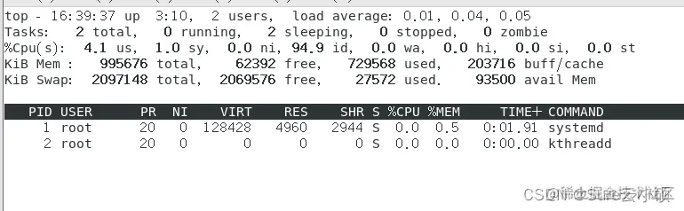 第四第五行:KiB Mem : 995676 total, 66648 free, 680676 used, 248352 buff/cache