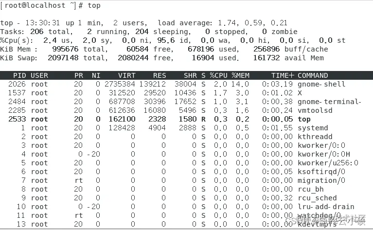 第一行:top - 13:30:25 up 1 min, 2 users, load average: 1.89, 0.60, 0.21