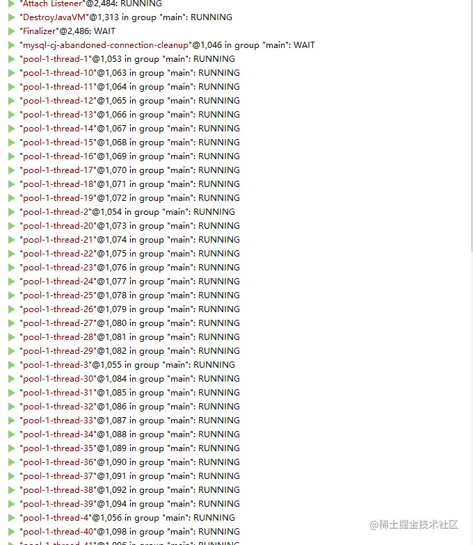可以看到上面的的代码就优雅多了,既把效率提上来了,也避免了产生大量的Connection对象。而且我们用idea查看线程状态,他们个个都是“活力满满”!