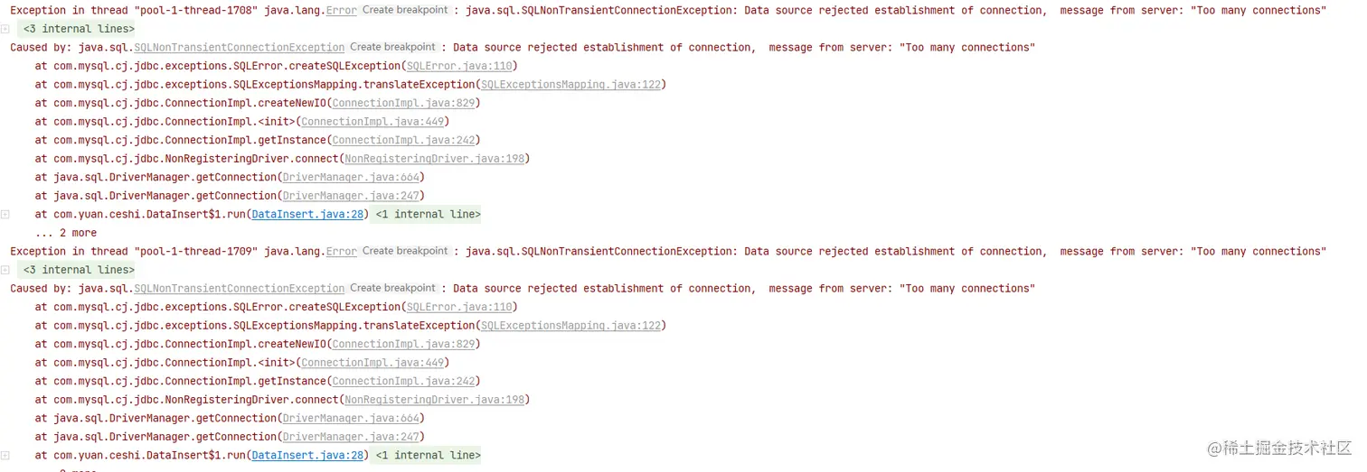 但是问题又来了,我报错了,我后面同时插入t1和t2表,所以最大可能占用160个mysql连接(代码里我给FixedThreadPool的参数是80,所以启动插入t1和t2会有160条线程同时插入),而mysql的最大连接数是151个,所以会有几个线程插入失败,报Too many connections****!!