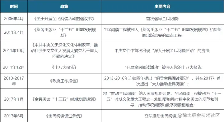 为推动行业的持续发展,政府相继发布移动阅读相关政策,2017年国家立法推动全民阅读,发布《全民阅读“十三五”时期发展规划》,将“推动全民阅读”纳入国家规划纲要,全民阅读工程被列为“十三五”时期文化重大工程之一;指出要加强对数字化阅读的规范和引导,推动传统阅读和数字阅读相融合。