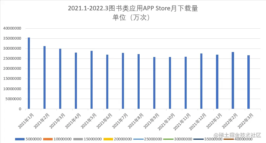 选自2020年1月—2021年3月的中国区App Store数据,阅读类应用月下载总量,基本每个月都能保持在2600万次以上的下载量增长,如图2-1所示